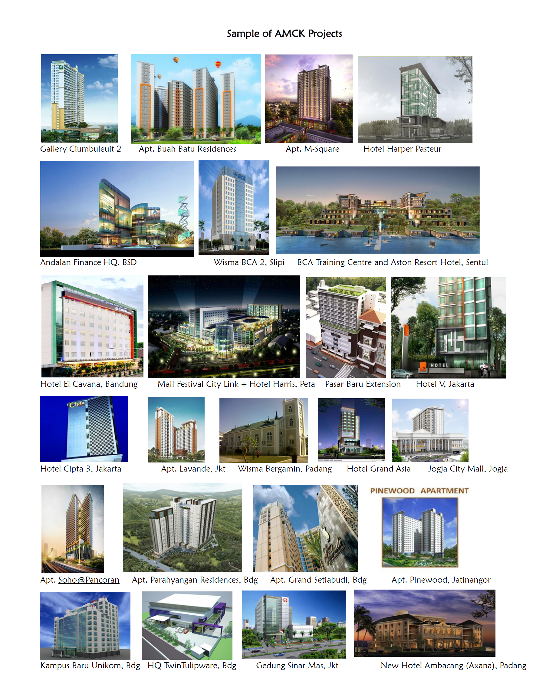 Apartment Soho@pancoran (APG, Jakarta), Vimala Hills (APG, Ciawi), Hotel Aston Resort and Training Center BCA (Sentul), Hotel Falatehan, Wisma WCA2 (Slipi), Kampus Ukrida II, Apartment Lavande (Tebet), Apartment Casablanca Mansion (Tebet), Tapa City Mall and Hotel (Jakarta), Apt. Marina Residences, Hotel V (Tebet), Superindo (Kemayoran), Gedung Sinar Mas (Tanah Abang), Hotel Asia (Bandengan), Bank BCA (Tanah Abang), Preliminary Design Overpass Tn.Abang-Kp. Melayu, Audit Gedung KCU BCA (22 Kota se Indonesia), Hotel Santika Simatupang, Apt. Skyline Cawang (2 Tower), Apartment Privillege (Bandung), Synthesis Tower (Gatot Subroto, Jakarta), dll.